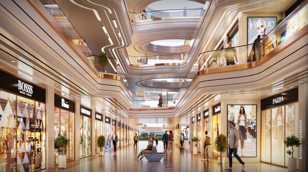 It includes a grand 40-foot tall entrance, wide internal boulevards, open-air courtyards, and 14 entry and exit points to improve movement and access. Crafted by well-respected international architects, the design optimizes brand visibility while fostering a pleasant shopping and leisure setting.