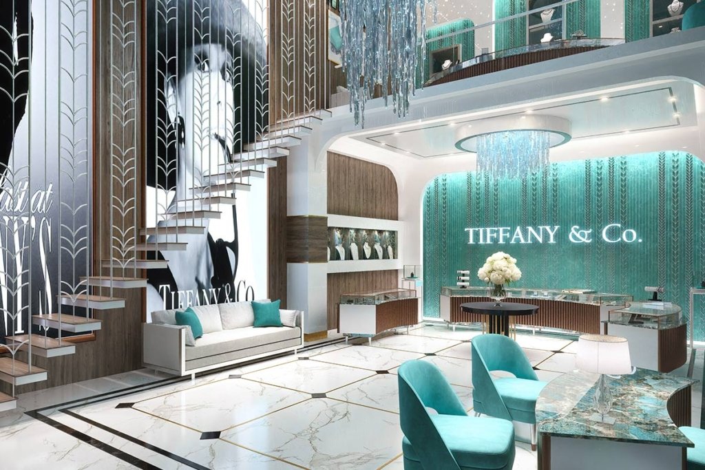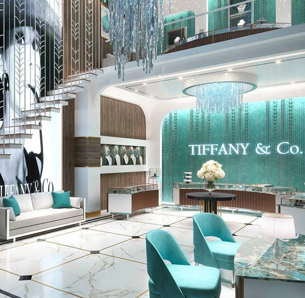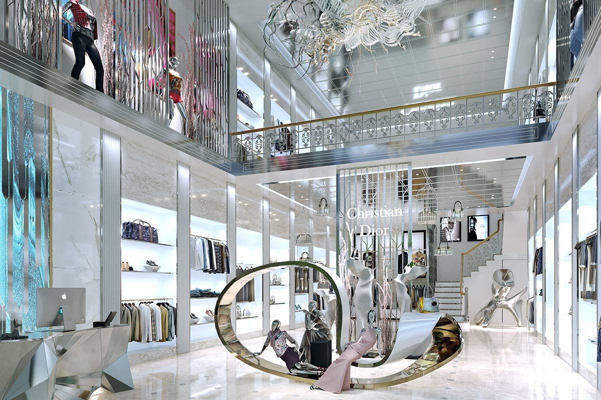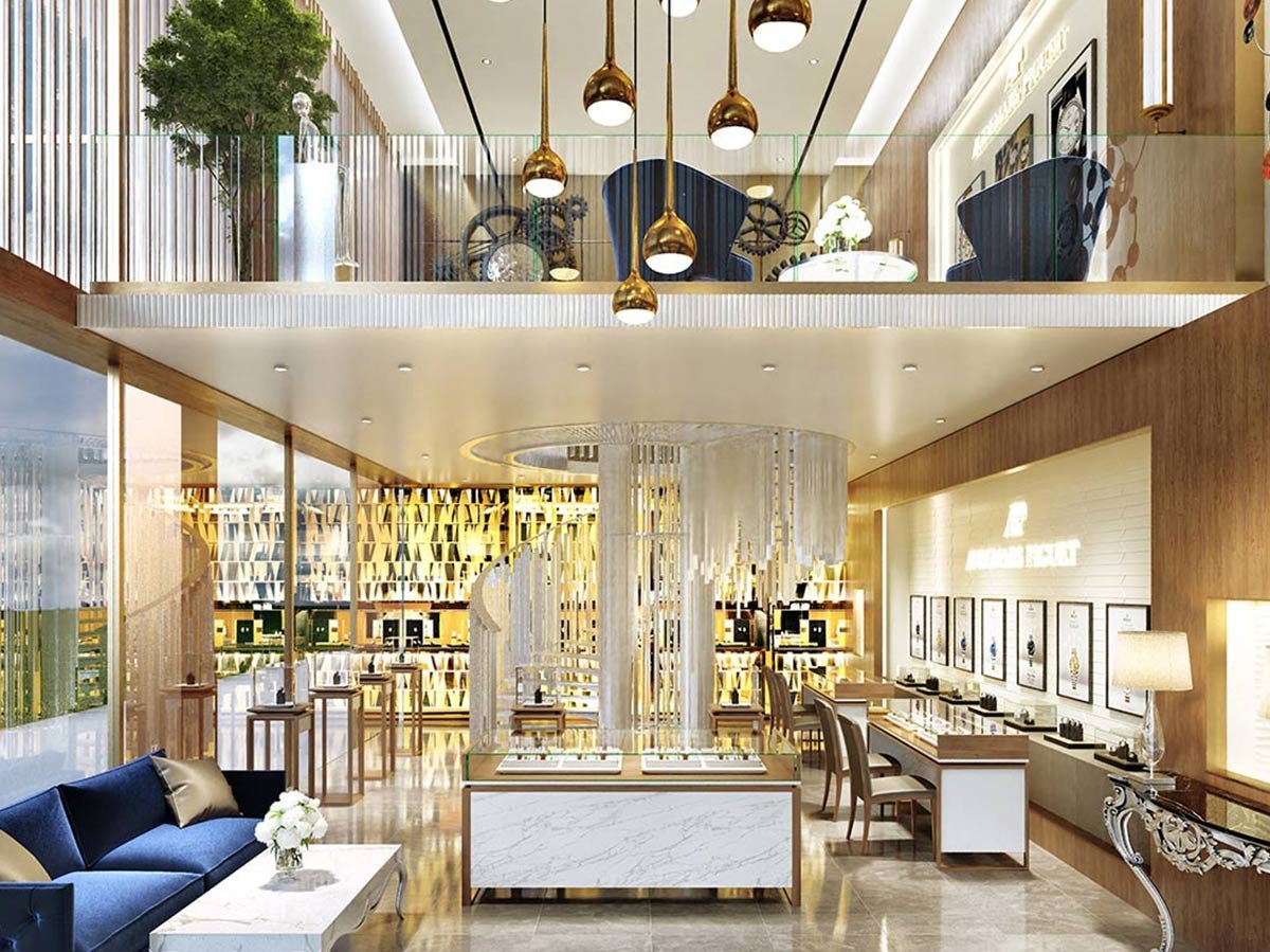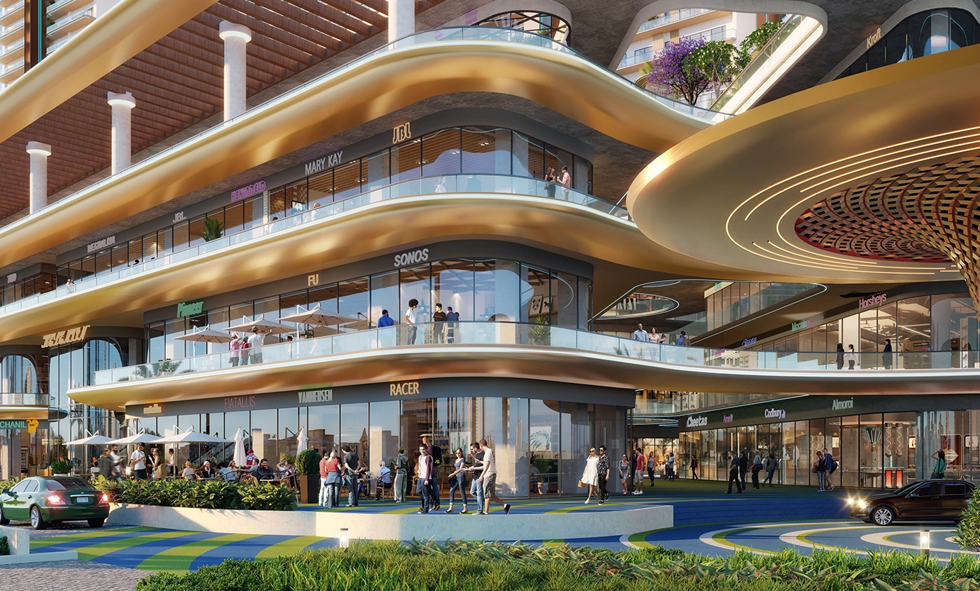 The project has high-street retail, office spaces, food courts, cafés, and double-height showrooms for flagship brands.